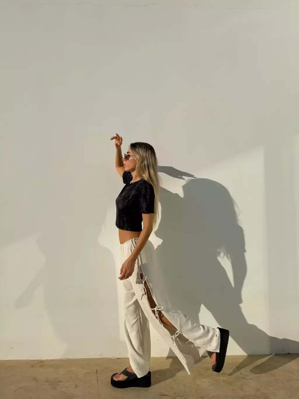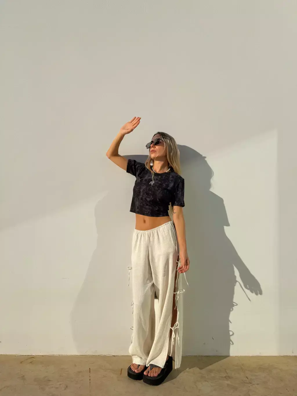 Pantalon amplio, tiro bajo, con aperturas laterales y lazos para atar. Bolsillos laterales y elastico en cintura.