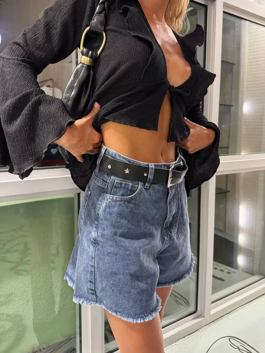 Short denim, tiro alto con ruedo desflecado.